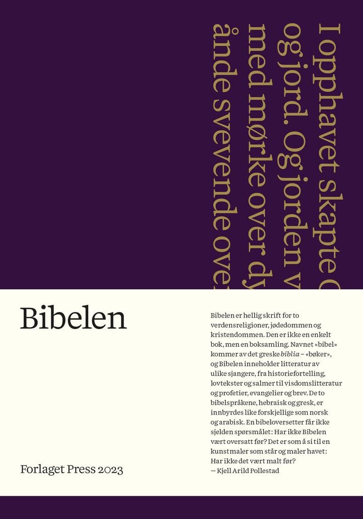 Bibelen er den mest sentrale boken i vår kulturhistorie, og har utkommet i en lang rekke utgaver siden tekstene ble samlet i de første århundrene e.Kr. Finnes det da et behov for enda en oversettelse? Ja, svarer Kjell Arild Pollestad, som i likhet med Martin Luther, om lag 500 år etter, egenhendig har stått for oversettelsen. I et fyldig forord til denne utgaven gir han uttrykk for sine beveggrunner, noe som kort fortalt handler om at tradisjonens lange historie med forhandlinger om tekstens form og innhold, paradoksalt nok har brakt dagens oversettelser i utakt med de originale tekstene.